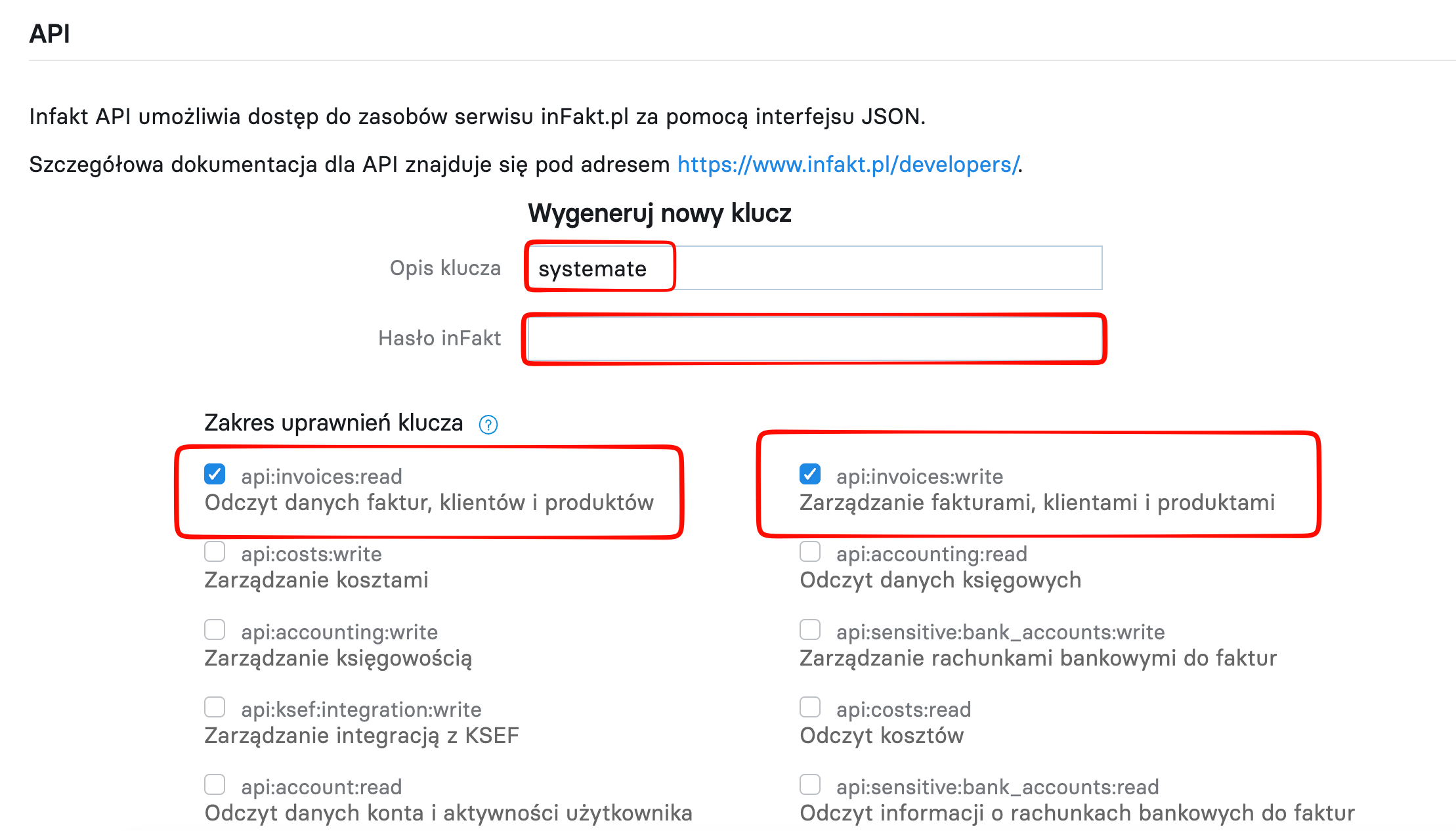 - zakres uprawnień klucza: api:invoices:read, api:invoices:write