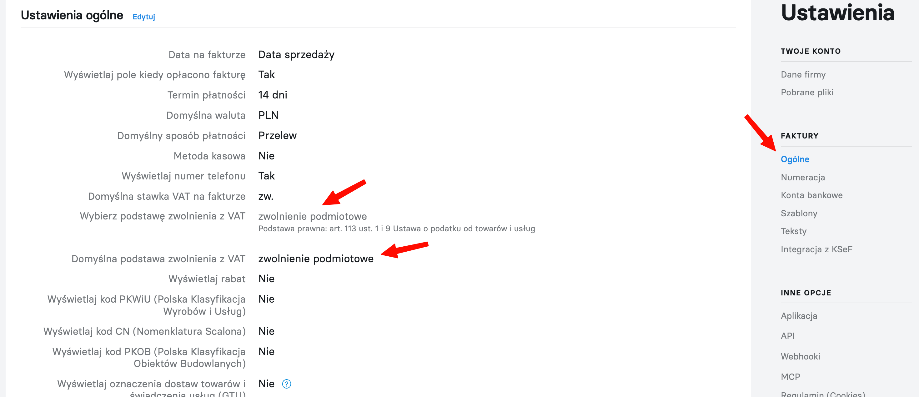 - Skonfiguruj poprawnie dane firmy w InFakt. W przypadku zwolnienia z VAT wybierz powód zwolnienia, w przeciwnym przypadku Faktury ze stawką „zw” nie będą wystawiać się poprawnie