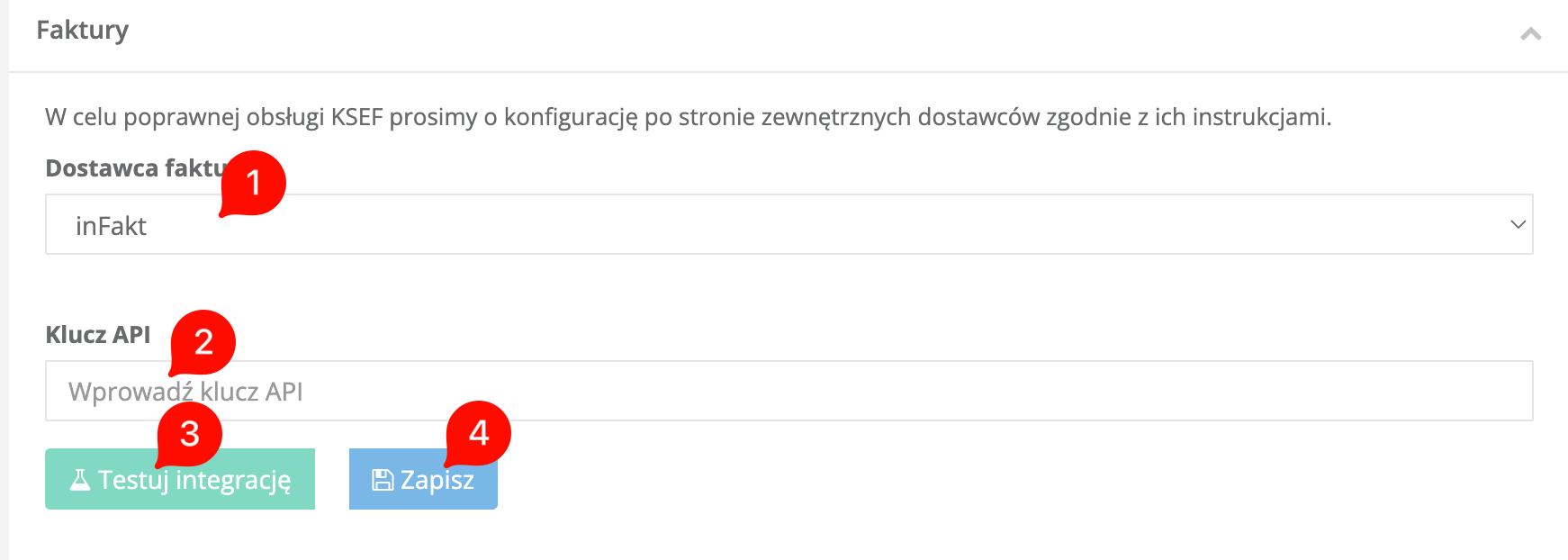 | W przypadku integracji InFakt numeracja faktur, połączenie z KSeF, wygląd dokumentów etc. ustawiane są z poziomu InFakt. W razie pytań, skorzystaj z bazy wiedzy InFakt. |